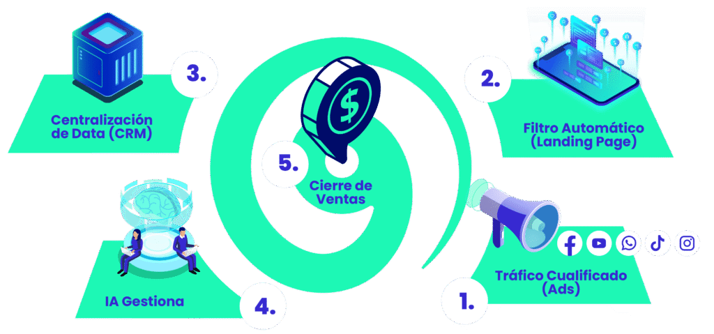 Implementamos el sistema estratégico que automatiza tu flujo de ventas, desde el primer clic hasta el cierre.